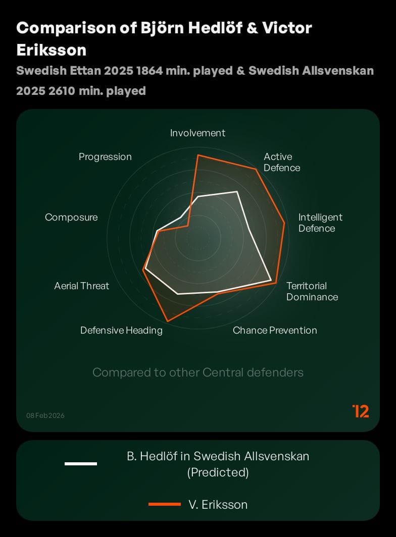 Vid en direkt jämförelse mellan Hedlöfs siffror från Ettan och Victor Erikssons Allsvenska data från 2025 syns tydliga likheter i deras spelstilar: