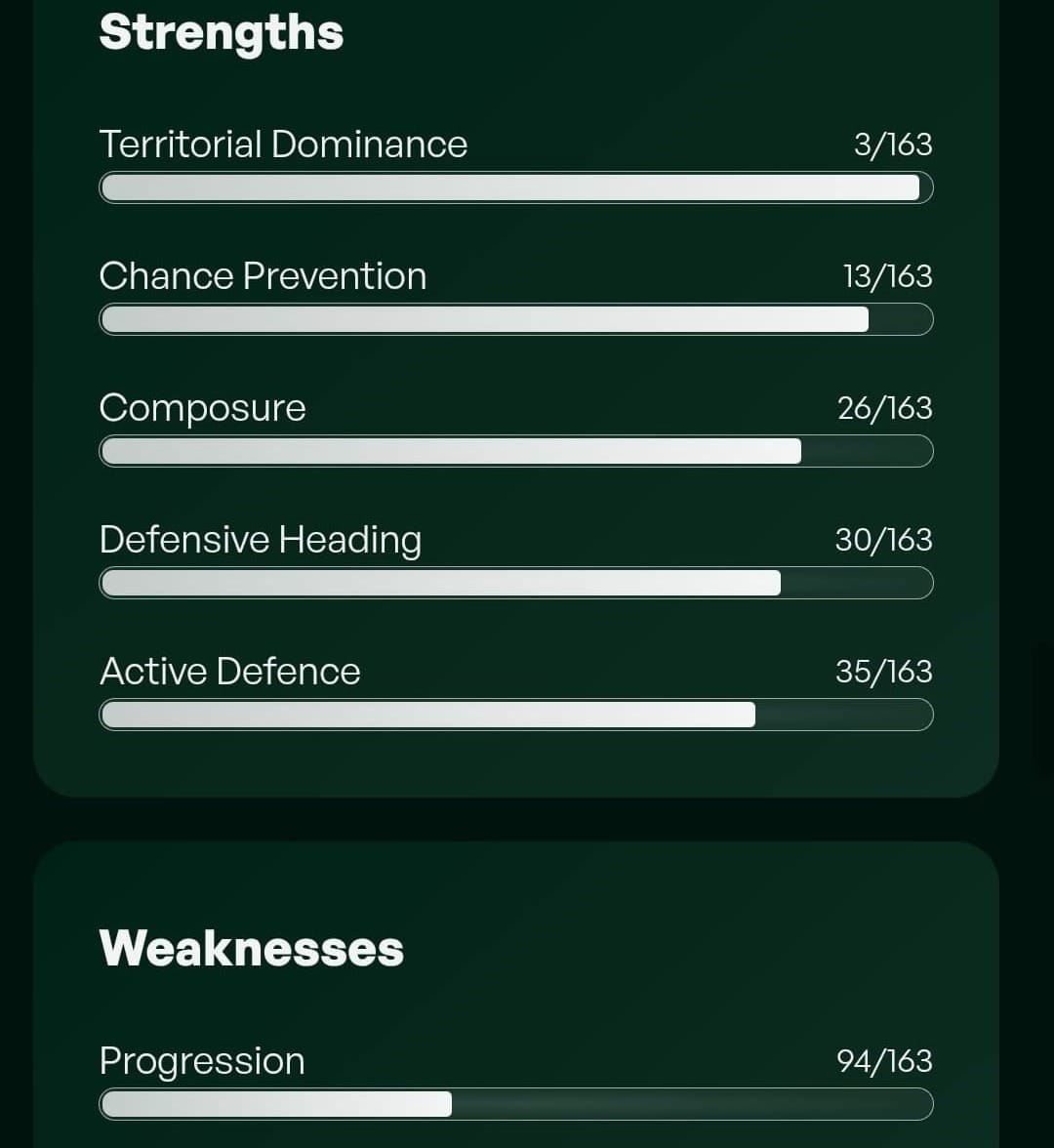 - Chansförebyggande (Rank 13/163): Han uppvisar en hög förmåga att läsa spelet och stänga ner ytor innan de leder till målchanser.