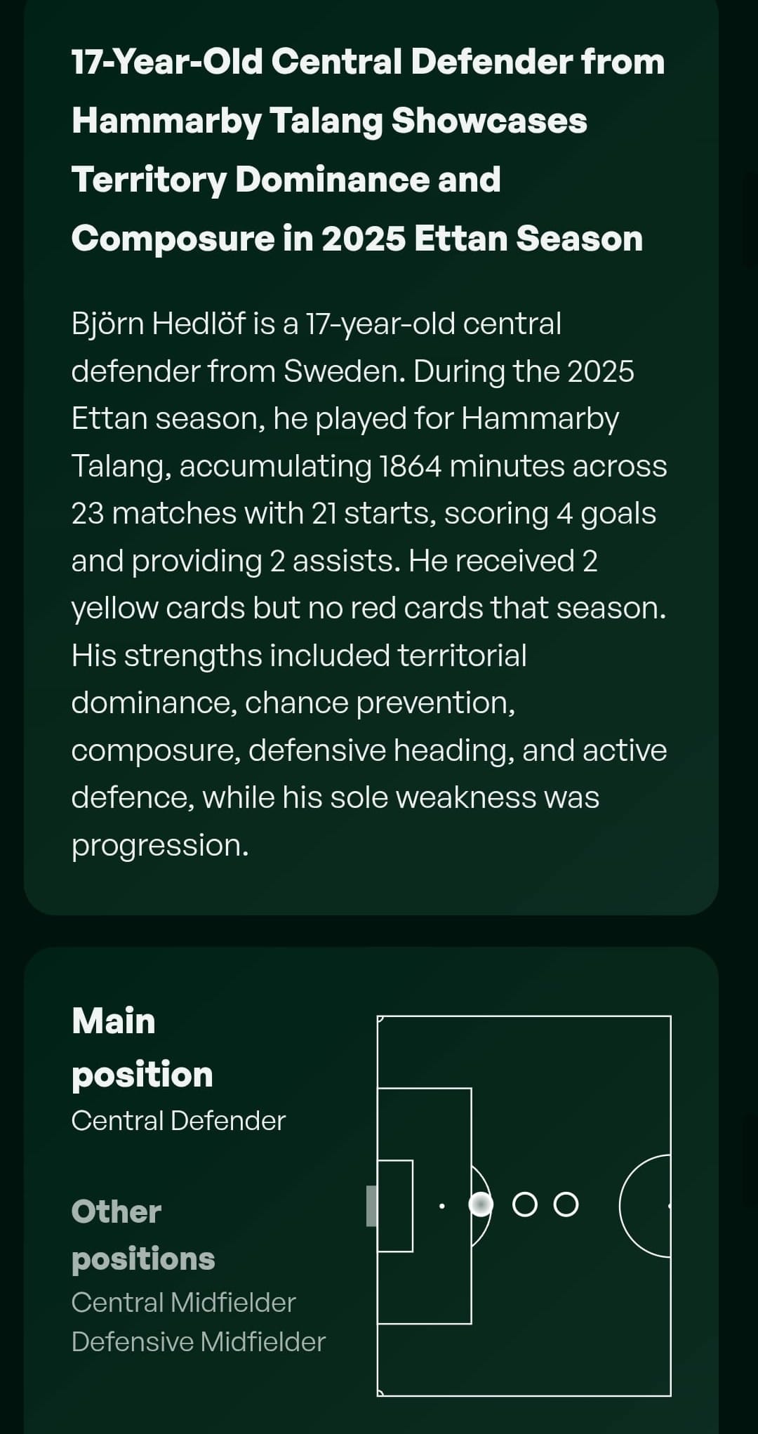 - Offensiv spets: Hedlöf producerade 4 mål och 2 assist under 2025, vilket ger honom en offensivare profil än den genomsnittliga mittbacken.