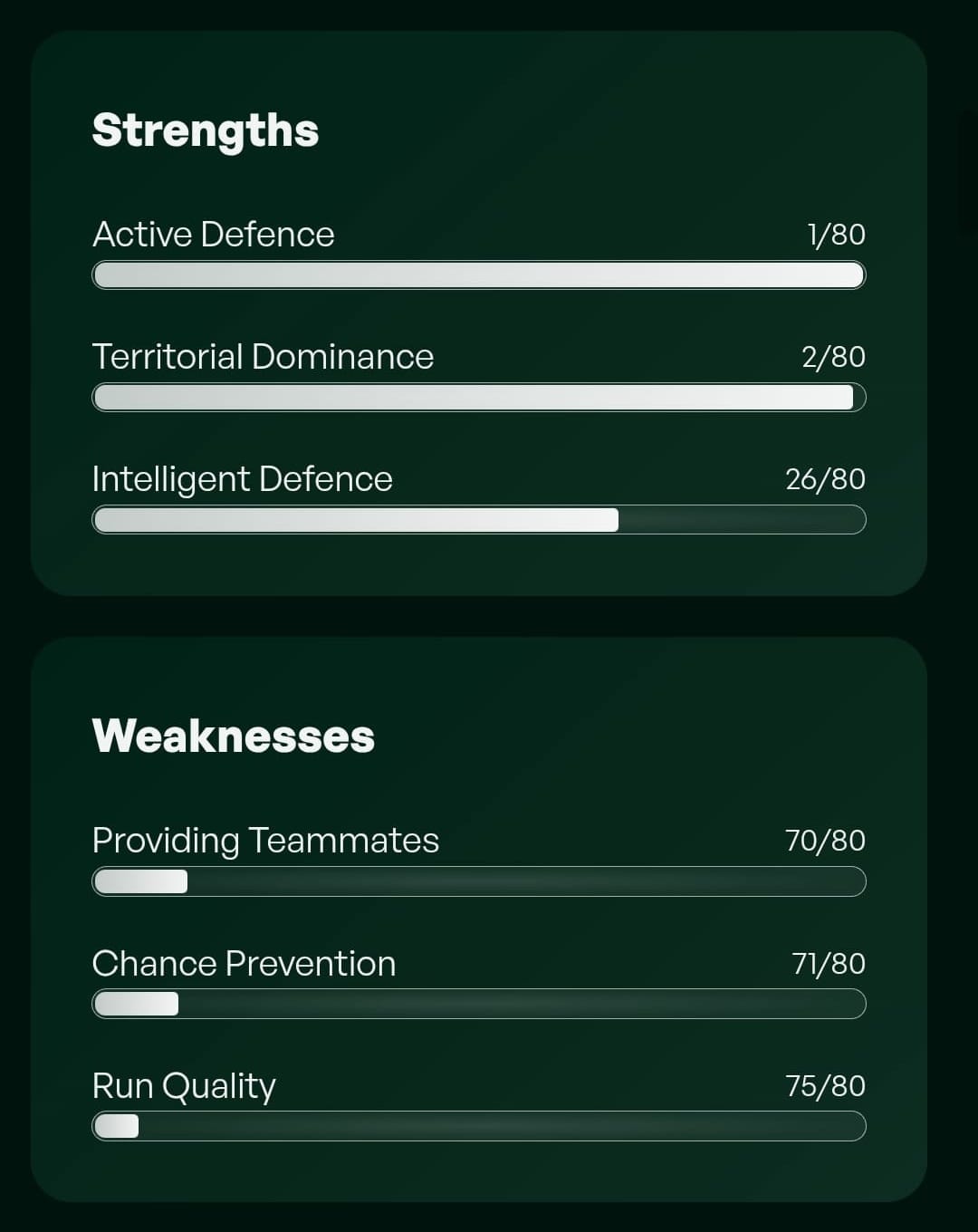 - Territoriell dominans: Rankas som nummer 2 av 80. Han är effektiv på att begränsa motståndarnas möjligheter att avancera in i hans defensiva zon.