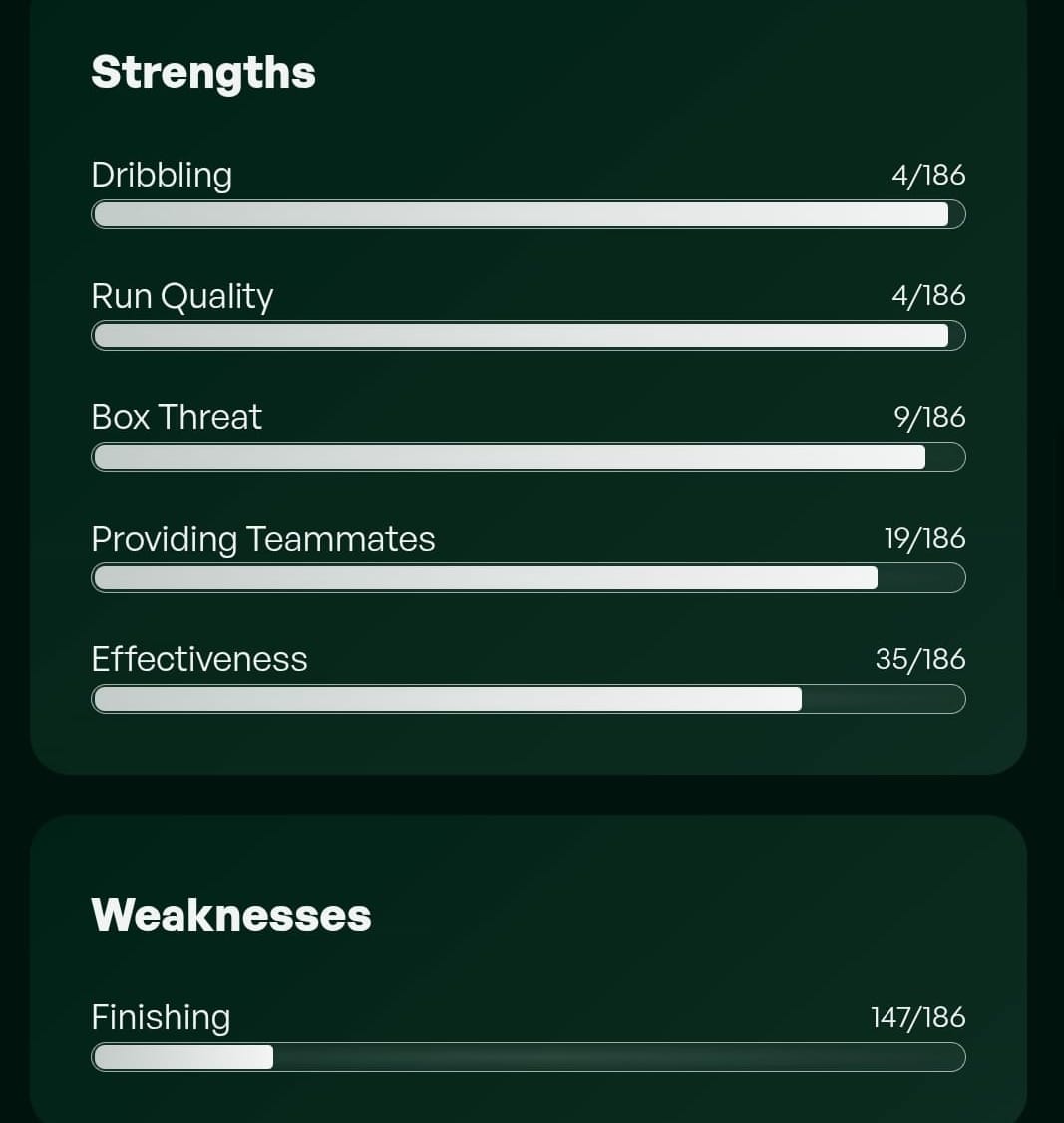 - Avslut: Hans främsta utvecklingsområde är effektiviteten framför mål, där han rankas lågt (147 av 186) i kategorin avslut.