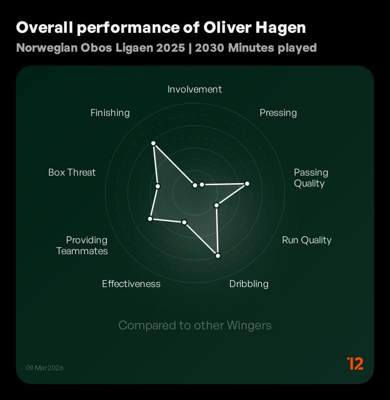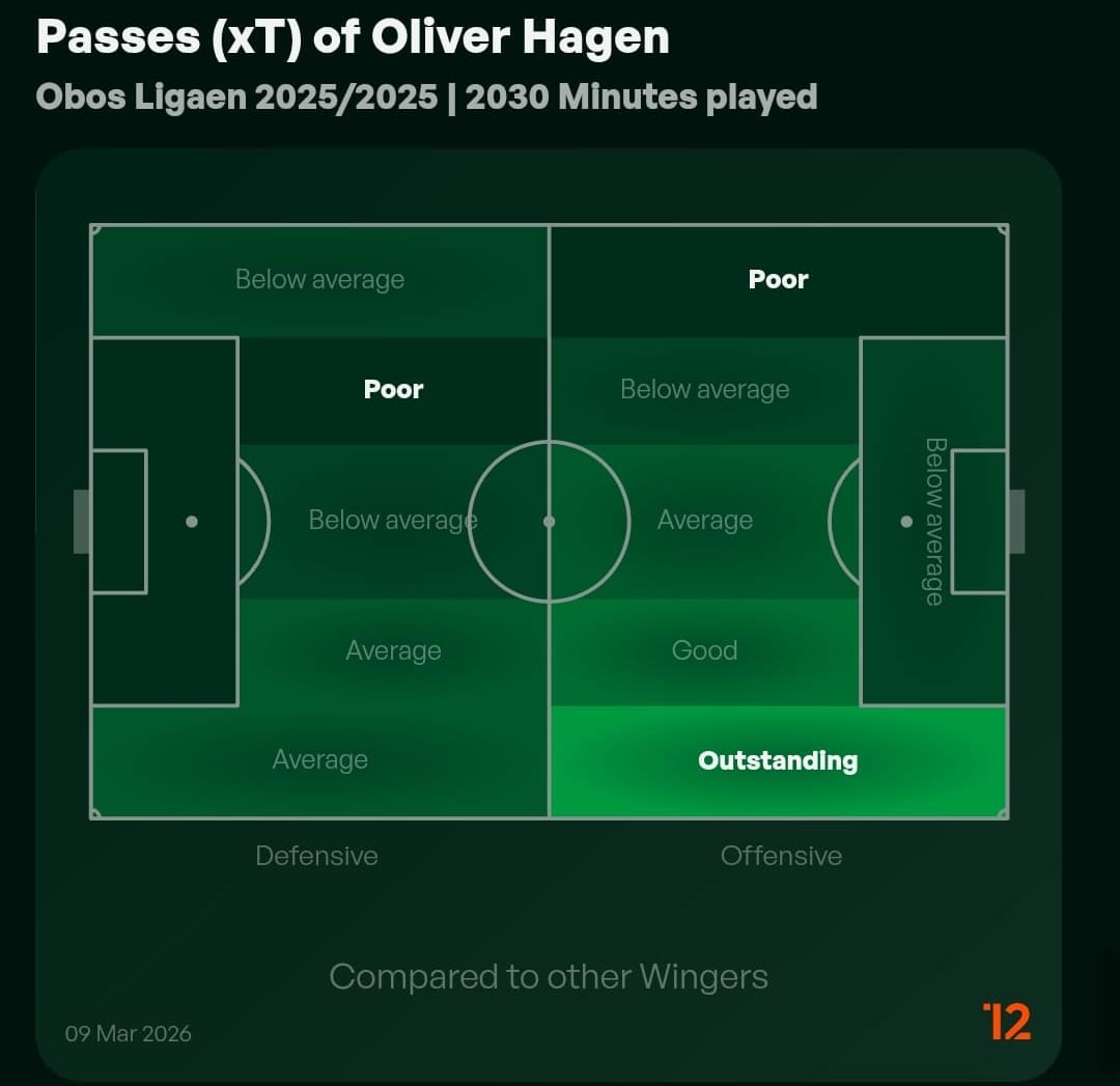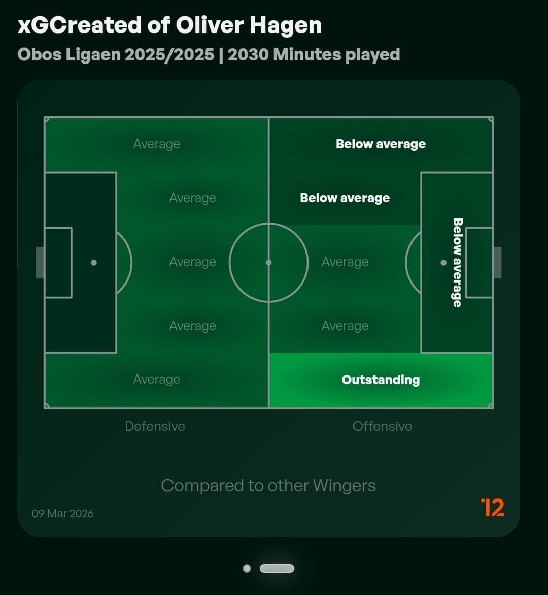 Det som först syns i materialet är att Hagen har sina starkaste siffror i moment nära motståndarna mplu, relativt rimligt för en offensiv högerytter förvisso. I jämförelsen med andra yttrar i Obos-ligan ligger han relativt högt i dribbling, avslut och delar av passningsspelet. Samtidigt ligger han lägre i presspel, run quality och involvering. Den samlade bilden är därför ganska tydlig: det här är i första hand en offensivt orienterad ytter, inte en spelare vars statistik visar jämn påverkan över hela spelet.