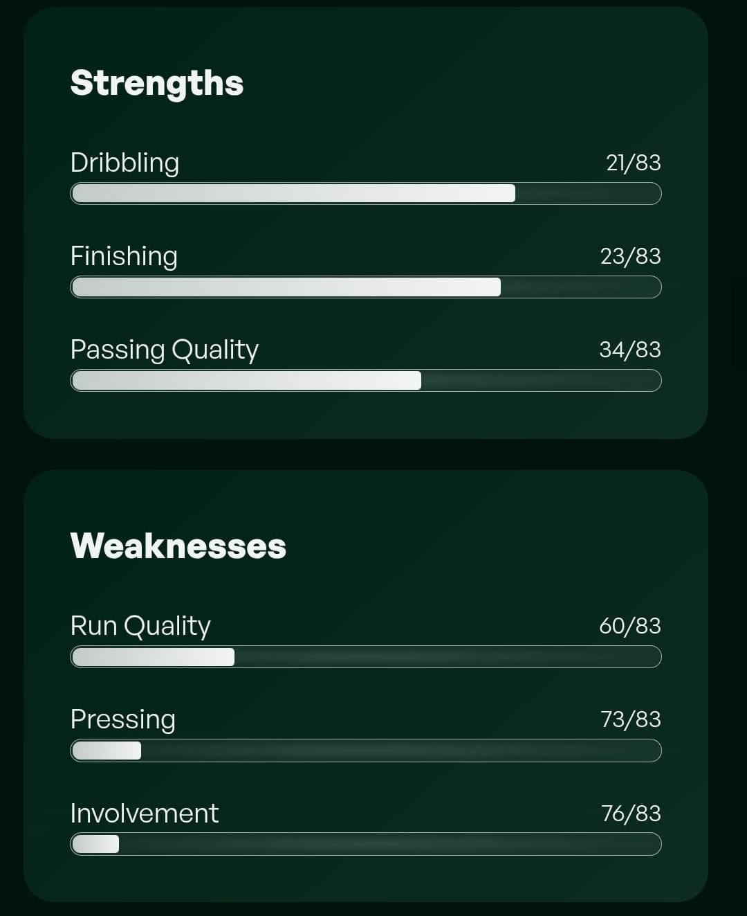 Den svagaste delen av profilen finns i spelet utan boll. Pressing, involvering och run quality ligger genomgående lägre än hans offensiva toppkategorier. I underkategorierna syns också begränsningar i defensiv intensitet, höga återerövringar och interceptions.