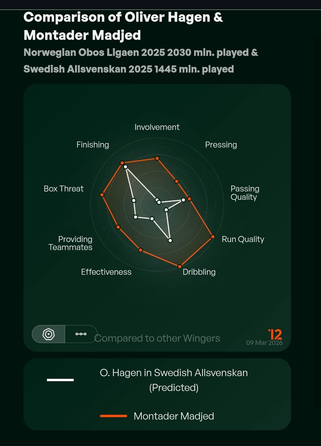 Den kanske mest intressanta delen av underlaget är jämförelsen med Montader Madjed. Där är det viktigt att vara tydlig med villkoren: Madjeds siffror kommer från Allsvenskan 2025, medan Hagens siffror i jämförelsen är en uppskattning av hur hans profil skulle stå sig i samma miljö. Det är alltså inte en direkt jämförelse mellan två spelare i samma liga.