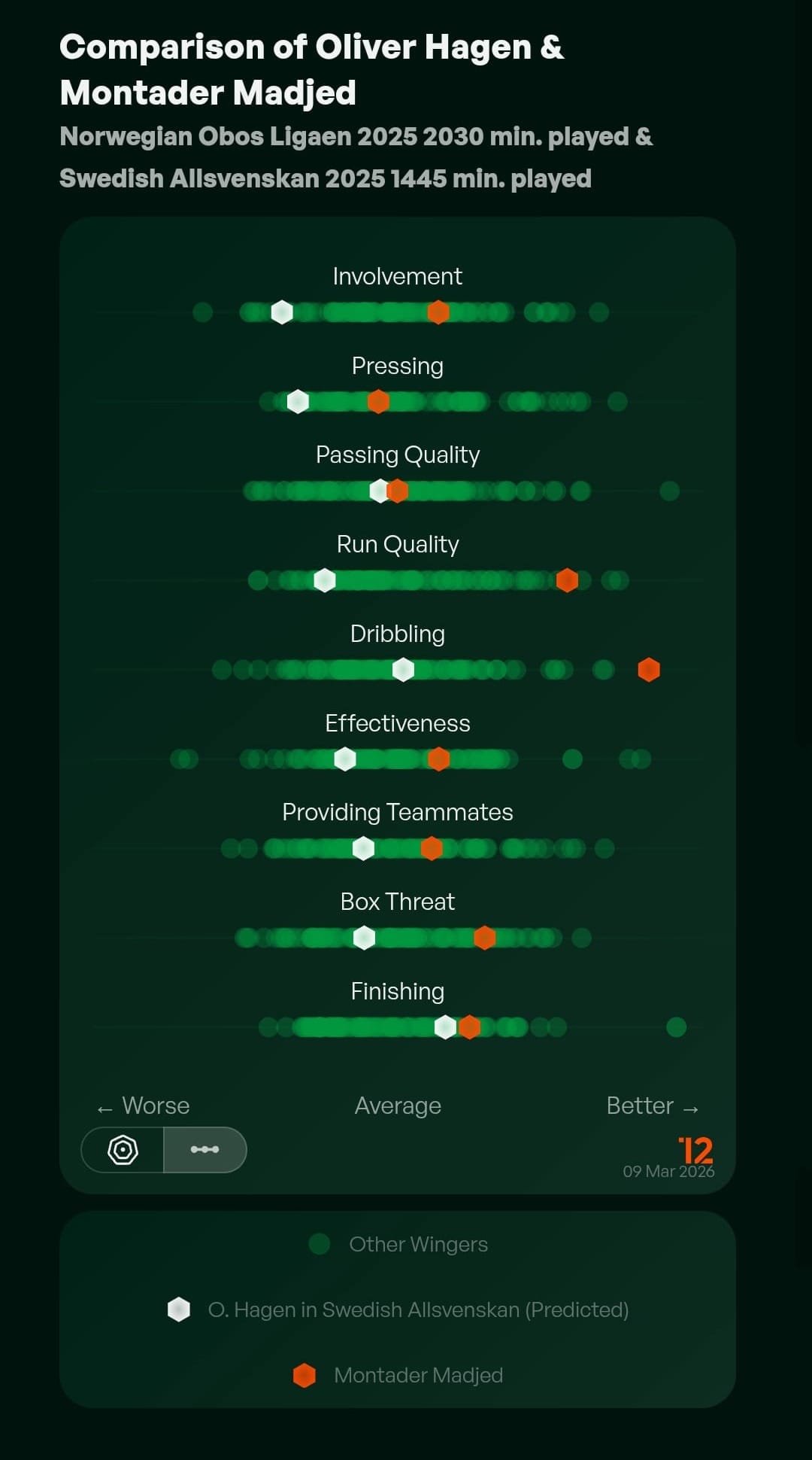 Samtidigt visar materialet att det finns en bit kvar i det som handlar om helhet: presspel, involvering, defensiv påverkan och hot utan boll. Därför framstår Hagen mer som en spelare för utveckling än som en direkt kopia av den profil Madjed redan visat i Allsvenskan.
